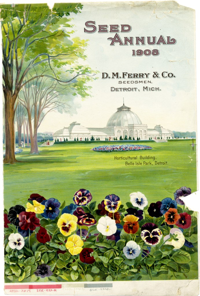 View of the cover of the 1908 seed annual for D.M. Ferry & Company, depicting the conservatory on Belle Isle with pansies in foreground. Printed on front: “1908 seed annual. D.M. Ferry & Co., seedsmen, Detroit, Mich. Horticultural Building, Belle Isle Park, Detroit.”